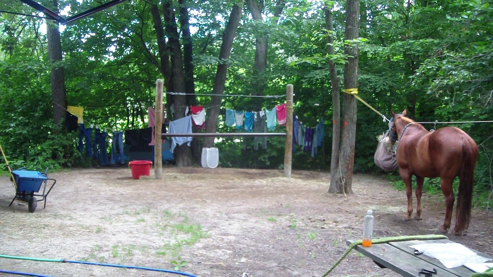Woke up at 4:00 in the morning with a possible solution to our problem, discussing it with Hubby once he woke up much later. Since the main problem seems to be the ranger worried about the trees, I figured, what if we created our own tree? If we could get a stand with a heavy bottom, a tall pole, and several guy wires, I figured we could built a structure that would hold the weight of the highline on one end, using one of the hitching rail posts on the other. The question was what to use, so I decided to leave early and go to Lowes to see what I could find. After doing a quick wash of the van and truck and a couple of the muddiest spots on the RV and horse trailer (all while also refilling the fresh water tank), I headed out, first to Rochester, where I found what might be the perfect solution, a heavy deck umbrella stand, and a pole that would fit into it. Just as I was leaving and heading to another store, the sky opened up with such a tremendous downpour that every parking lot turned into a river. After waiting for the rain to abate, and looking at the radar and seeing that more was on the way, I decided I’d better head out and get out of the storm. After a few miles, it started to lighten up, and by the time I was halfway to Minneapolis, the roads were dry and the sky was mostly sunny. Arrived just under an hour from my niece’s flight, got a gate pass from the airline so I could get through security and only had to wait a short while before her plane got in. She was one of the first off the plane, and we headed down to baggage claim where we had to wait over ten minutes for the bags, but they also came out nearly first, and off we went! Even though they had provided her some food on the airplane, I hadn’t eaten since breakfast, so we stopped at McDonalds along the way for a burger and fries. We stopped again in Rochester to pick up groceries and a prescription for Hubby that I had phoned in earlier, and once more in Spring Valley to get gas. Arrived back in camp about 9:45, later than we had thought, but only shortly after it got completely dark. Hubby said it had rained heavy for better than 5 hours!! Some storm! We unloaded groceries, gave her the grand tour, chatted for a little bit, then she headed out to the tent to get set up and go to bed. We followed suit, watching a short half-hour Gunsmoke before we headed to bed.