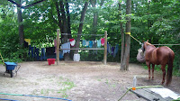 Woke up early, packed up, flushed out the tanks at the dump and hit the road by 8:30. Dropped mail off at Spring Valley, got an electrical adapter Hubby needed for the generator at an RV store north of Rochester, had stops at Walmart, Tractor Supply and for fuel before arriving at the park, having gotten misdirected by my GPS and essentially circling the entire park before finding the main entrance. It was a bit disconcerting, as at the end of the road they have a sign that there is a bridge out ahead, but nothing to indicate whether it’s before or after the park. I quickly called and confirmed we could get through, and soon got to the office, where we got all signed up and registered for the next ten days. Fortunately, the site we had picked out on the campground map and Google Earth turned out to be just as good as we had hoped, and was available, so we’ve found ourselves a nice private site completely surrounded by trees, with a very long pad so there’s easily room for all our vehicles. Unfortunately, MN is another state that thinks you can put horses at a hitching post for days at a time, but we did find a couple of trees to set up a highline with only minimal interference with the fire grill. Although we have electric here, water is limited to just a few spigots, one of which is across the road from us, so we ran out almost every hose we had to reach it and started filling up our tanks. Meanwhile, a thunderstorm popped up, so while we were trying to solve our siphoning problem (we had bought the hose we needed at Tractor Supply), we managed to get pretty wet in the process. Frankly, I didn’t mind, it had gotten pretty hot just before the storm, and the cold front brought fabulous relief! Unfortunately, there didn’t seem to be much cell phone signal here, though I did manage enough to get online to check my email, but not enough to make a phone call. I was hoping to change my neice’s reservations from the St. Paul airport to the Rochester airport, but I ended up driving out of the campground several miles to get a good enough signal, only to be put on hold for 20 minutes, then immediately transferred to another department that started with a recording saying the wait time could be as much as an hour! Didn’t have the battery life for that, so I ended up getting back to the camp at 7 empty-handed. Meanwhile, Hubby had put up the highline and fed everyone, though he hadn’t put up the satellite dish because I had it with me in the van (plus it really takes two to do it properly). So we settled in for the evening using the DVR as our entertainment, knowing that most of the news would probably be all about the new prince that was just born in England today, to Kate and William anyway.