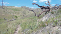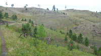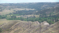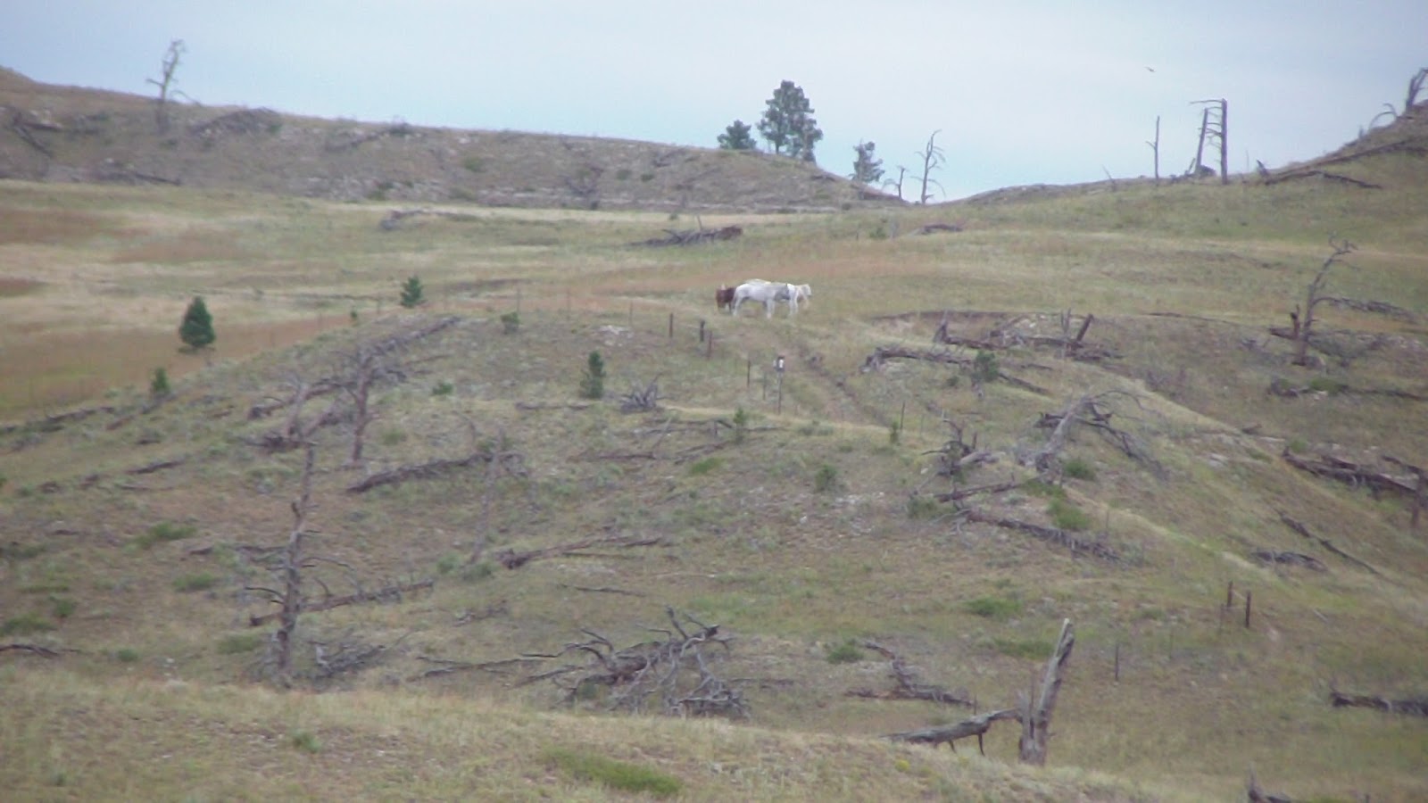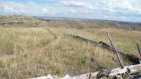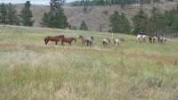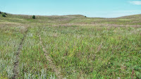 If you ever want to come someplace where you truly feel like you’re all alone in the wilderness, this is the place! From this campground, you can’t see a single structure other than the two vault toilets and the corrals, for as far as the eye can see! I even got out the binoculars and could just barely make out some kind of farm many miles away, not viewable with the naked eye. It was so quiet last night, it was hard to get used to after being in so many places where you could hear traffic noise, or tourists driving by. No one would ever come out here by accident, not subjecting themselves to 6 miles of bad road to get here, that’s for sure! After a leisurely breakfast, we saddled up the horses and headed out on what I had planned to be a short, five mile or so loop around the western part of Ft. Robinson State Park. We crossed the water crossing and started heading up through the grasslands, until we reached a gate. According to my GPS (which was a map based on the printed map from the BLM), if we went through the gate, we’d be going in the wrong direction, even though that’s the way the white trail markers went. Instead, we followed a fenceline that seemed to take us in the right direction, but soon my GPS was showing we were going way off track. Instead of turning around, we decided to continue along the fenceline until it met up with the back half of the loop, then follow it backwards. At least then we wouldn’t have to follow the road at the end of the trip, which was our original plan. When we reached the intersection, we saw the trail clearly straight in front of us (though, it turned out that we should have headed left at a lesser marked intersection) and climbed up a long grade to the top of the bluff, where we were met with some simply spectacular views! All 360 degrees around us were incredible, the kind of view that just can’t be done justice by a few pictures or a verbal description. Absolutely stunning! We continue to follow along the well-marked trail for a while, passing several markers laying on the ground, but it seemed to be heading along just fine. Then we came to a place where there was a picnic table and what looked like a collapsed shelter, and just beyond that, we came across a small herd of more than a dozen horses! I doubt they were wild, someone likely just had them grazing out there, but they were definitely related to each other, and they were beautiful! Several red roans with gorgeous faces, a couple of rare blue roans, some grays and whites, and two sorrels, one that looked a lot like my Apollo, though with a larger blaze than his perfect diamond. Well naturally, my guy got a bit excited by that, and we had a few scary moments while we tried to pass them, though they were planted right at a marker, but we saw the next marker and made a beeline there. Curious, the horses kind of followed us, which made my guy more antsy, but eventually we got around them to where the next marker was. That led to a gate, which was next to a pasture with some cows in it. After just one short startled moment when he spotted the cows, Apollo was very good about ignoring them, for which I was grateful. Quite a change from just a few months ago! Well, after all, we’ve conquered buffalo in the wild, right? What’s a couple of cows anymore? We went through the gate, and after a short bit, I checked my GPS, which confirmed what I had already suspected, we were going WAY off track, in exactly the opposite direction we needed to go to get back to camp. The problem here is that there are no markers except white diamonds, and white diamonds are used on EVERY trail! So, unfortunately, we had to turn around, deal with the gate, the cows and the horses once again, past the picnic table, until just beyond that we came to a marker that was on the ground. We had seen it before, but what we hadn’t seen was that in addition to the marker that was directly in front of us (and the one we followed), there was an additional marker to our sharp left (which was now almost directly in front of us on the return.) So we got back on track there, and followed that trail, which fortunately at least was in the same general vicinity as the GPS said it would be. This trail basically followed the ridgeline, so the views were universally spectacular, with every curve providing another view of distant horizons. We could even see what looked like the Black Hills from here! Fantastic! Another mile or so on and we ran into yet ANOTHER small herd of horses, mostly white and gray, a couple of which were huge draft horses, and a burro with paint coloring, which I’d never seen before. Of course, they were right in the middle of the trail, and we did our best to skirt them, and managed to get by with only one scary moment when Apollo had the urge to back himself toward the group, which I saw as an invitation to a kicking match, but I managed to get him out of there before any excitement began. The rest of the trip was uneventful, though there were a few rather steep rocky sections coming down that way. For the most part, we probably didn’t need boots, but for those areas where we did, we were very glad to have them. Got back to camp and got everyone settled, then anxiously downloaded my GPS info onto my computer, since this seemed to be a classic case of what the maps says and what’s on the ground as completely different from each other. It turned out that our 5 mile trip ended up being 8.25 miles, and less than half of it was on trails that I had designated as our path. I learned that we missed one intersection completely, and that the GPS trail made from the hard copy map didn’t seem to have much in common. I can’t say I was too surprised, because when I tried to line up the overlay on Google Earth, it didn’t seem to match up very well, even on the highly visible landmarks like roads! Well, still, it was a great ride, we saw fabulous views, everyone got home safe and sound, and ultimately,