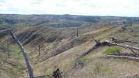 Once again, planned a route on Google Earth and downloaded it to my GPS, and once again, it was so far off from what was on the ground we ended up going WAY in the wrong direction. For starters, the map has the trails on it, but evidently doesn’t bother to include the forest service roads, so when we headed out through the gate on the north end of the campground area, we headed along what we thought was Trooper Trail, but we found out later was an unmapped service road (even though it was obviously the main dirt road through the park). My GPS indicated we should be traveling the same path, only about a quarter mile south. We made several attempts to go south to try to pick it up, only to be stopped by the creek (which we crossed more times than I bothered to count) and a row of bluffs that were impossible to climb. We learned later that in order to find the trailhead of Trooper Trail, we needed to turn south IMMEDIATELY after going through the gate, but there were no visible signs there, of either a trail or of signs pointing to a trail, so we totally missed it. After several false starts, we finally just kept going on the dirt road (after all, the point was to ride, not which trail we rode on, right?) but eventually we passed the west intersection of Boots and Saddles, one of the two main trails here. We turned south on that, thinking it might take us to Trooper Trail, but the trail seemed to peter out, and when we came to a gate, we abandoned it and went back to the main road. We continued west, hoping to run into the original trail I had planned on, but then we came to another gate, and didn’t feel very confident about carrying on any further. Naturally, the road was boring, so we decided to return to the intersection of Boots and Saddles and take the north loop of that back to camp, as that had been an alternative to begin with. We started climbing, and the trail did get a lot more interesting, and was well marked with posts all along the way, weaving around the edges of some serious bluffs, lots of down and dead trees leftover from the fire in ’89, a bit treacherous in a few spots, and longer than we had hoped, but we took a break in a place with spectacular views, of which there were many others, and treated the horses with a couple of apples, taking a nice rest there. Eventually we made it back down to camp, though Hubby’s back was starting to give him trouble on the way down. It seems it’s steep declines that give him the most trouble. We got settled in as quickly as we could, had dinner, invited the ladies next door in for another Bond movie, and had another quiet evening.