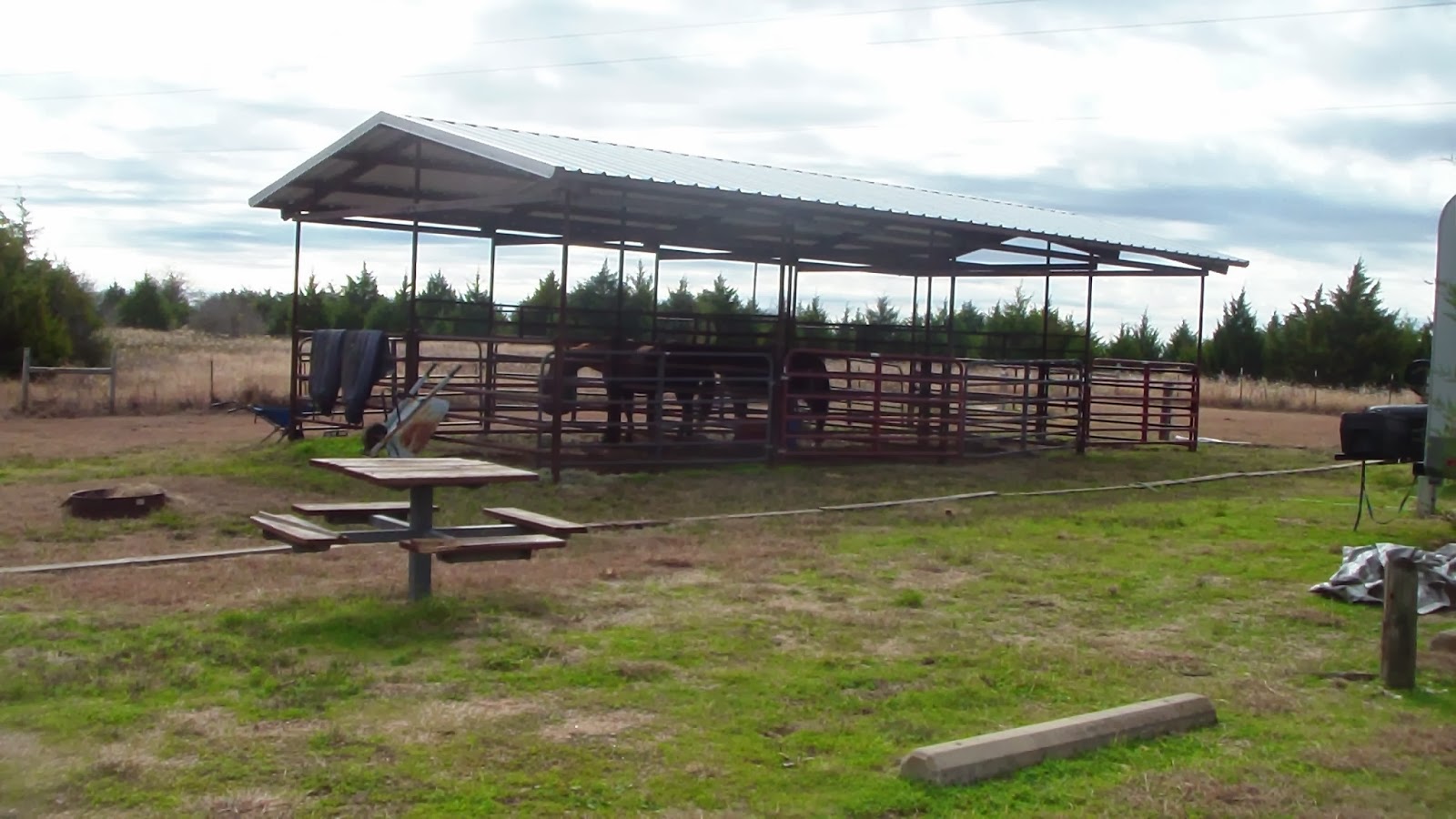 Though the alarm went off at 7:30, we put the heat on and snuggled until it warmed up a little, so Hubby didn’t get up to start coffee until nearly 8:00. Since we hadn’t done much prep work last night, it took a bit longer to get packed and out, departing the campground about 9:20. Unfortunately, the forecast changed again since last night, which had been a mere 20% chance of rain after noon, but instead we ran into some pretty good drizzle by 10:30, so the hay was getting damp. Fortunately, it’s pretty tightly packed, and we only have about 6 bales left, so it will probably be fine. We decided to skip shopping entirely and head straight to camp and get set up asap. We had no trouble finding the park, which actually had a manned entrance. They were kind enough to let us run out and find which site we wanted and then I returned to sign in a bit later. We were delighted to discover that the eight corrals here were covered!! What a nice surprise! I thought I remembered seeing a roof of some kind on Google Earth, but didn’t realize those were the actual corrals. We were suddenly much happier with our decision. Plus, there were some very bushy cedar trees separating each site, providing a darn good wind break as well, though they were too short and healthy to be any threat during an ice storm. The electrical breaker gave Hubby a little problem, but he managed to re-seat it and resolve it. It didn’t take long to get set up, and with a quick satellite setup, a great cell phone signal, and 30 amp electric, suddenly the oncoming storm seemed much less threatening. We also got a trail map that showed a lot more trails than advertised, and because it’s a national campground (Army Corp of Engineers), they honored Hubby’s Golden Age Passport, cutting the price in half, from $16 to $8. Such a deal!! Although there are large electrical lines nearby, they’re far enough away to be of no consequence. I put the horses in two dry corrals and before we knew it, we were home once again! No worse for the wear, and congratulating ourselves on making the great decision to move. Monday we’ll go shopping and get more propane and everything else we need, just as we would if we had moved on Monday. Supposed to be in the 50’s by Thanksgiving, so it may turn out to be a good week after all!