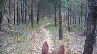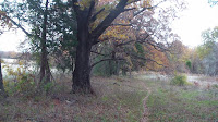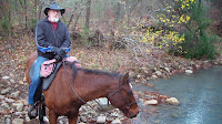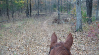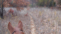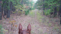 Getting used to the shorter days and waking up earlier, we both had a better night sleep out here, it’s so quiet for a change! No planes, no trains, and hardly any automobiles, even though we’re right off a pretty good FM (Farm to Market) road. We were out on the trail by about 11:30 or so, heading out what appears on the map as the Pink Trail, or Trail #3 as it’s marked. We took the extended loop, and fell in love with the footing! After so much rocky terrain, we were so happy to at last have dirt and sand footing, with just a few roots occasionally, as you’d expect in a forest. Despite being part of the National Grasslands, there’s nothing grassy about this trail, it’s all through woods, with only one short stretch in the open that looks like a utility track, but no poles or wires, just a narrow stretch of field. Loved it! The horses started out expecting something else, and we could just feel them relax as the trail went on without incident. We were finally able to do some trotting, but other than the short field I just described, there really wasn’t any place suitable to get in a good canter, though we did a little on short stretches up small grades. The trail winded around the northwest corner of the park, then dropped south to a river, which then flowed into a lake, with the trail followed east and finally back to camp It was just 6 miles, so we were back within a couple of hours. Just the right length for our first exploratory ride, and apparently about the same length as most of the other loops out of the campground, making this a perfect place to ride for a week, maybe more. Hoping the weather holds out for that! Might even retrieve the parkas from storage so we can ride when the weather is cooler, this is so nice here! Plus, since it’s a national forest, with a Golden Age passport, it’s only $3 a night. Just our kind of place! As we were putting the horses up, a guy we had seen earlier on a tractor, drove over and asked if we minded if he parked his tractor next to us. He and a partner were cutting up a downed tree and he didn’t want to have to keep trailering it is. Of course, we said we didn’t mind (though I did mention I might want to take it for a joy ride later : -), to which he said the tank was full, have a good time! I like the folks here, everyone has been really friendly so far. Must be Texas! Anyway, had some chores to do in the afternoon before settling in for the night, wishing we had gotten here a week or two earlier so that we could enjoy the weather longer. Fingers crossed it’s not as cold as they’re forecasting now for next week!