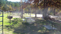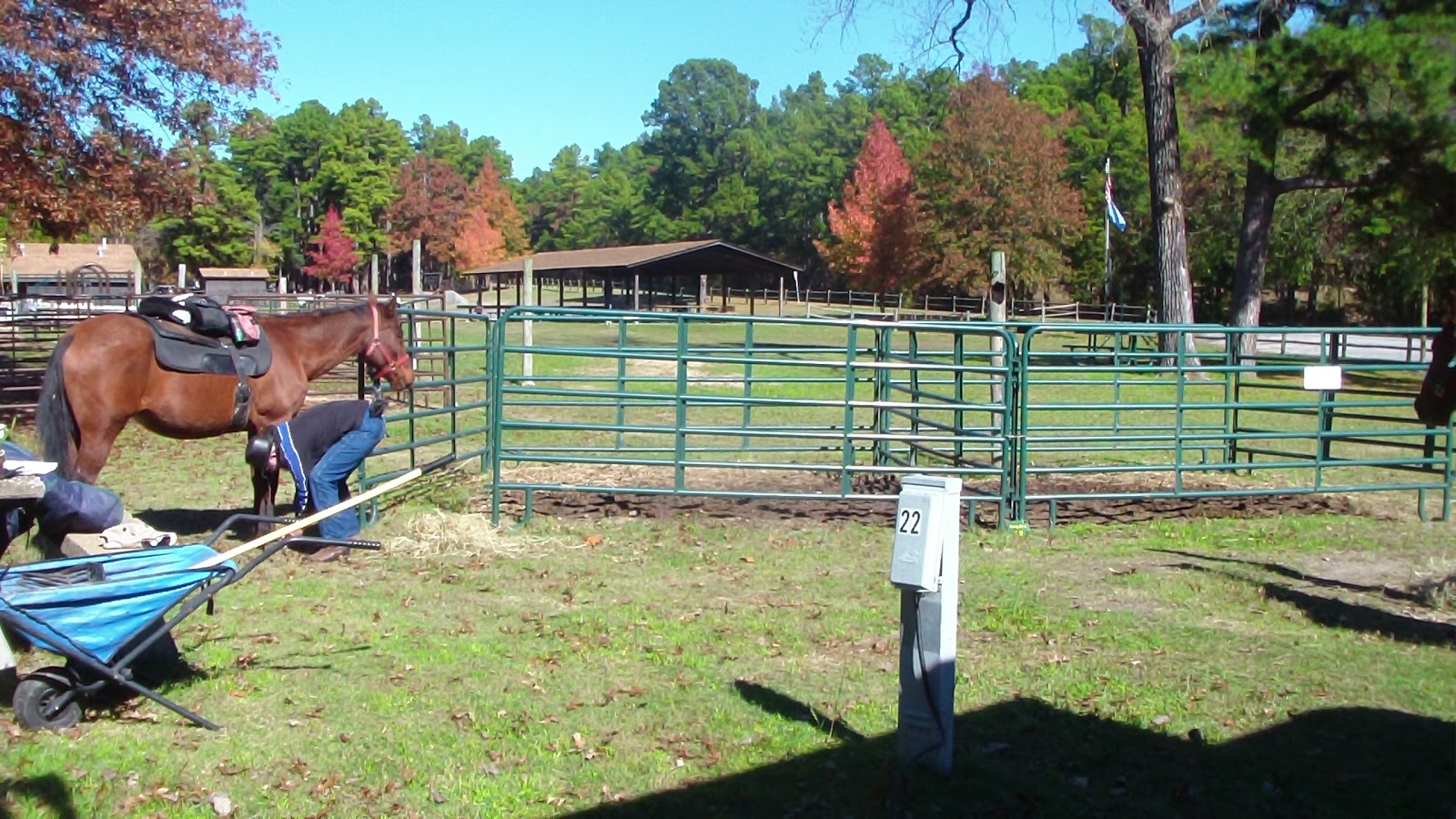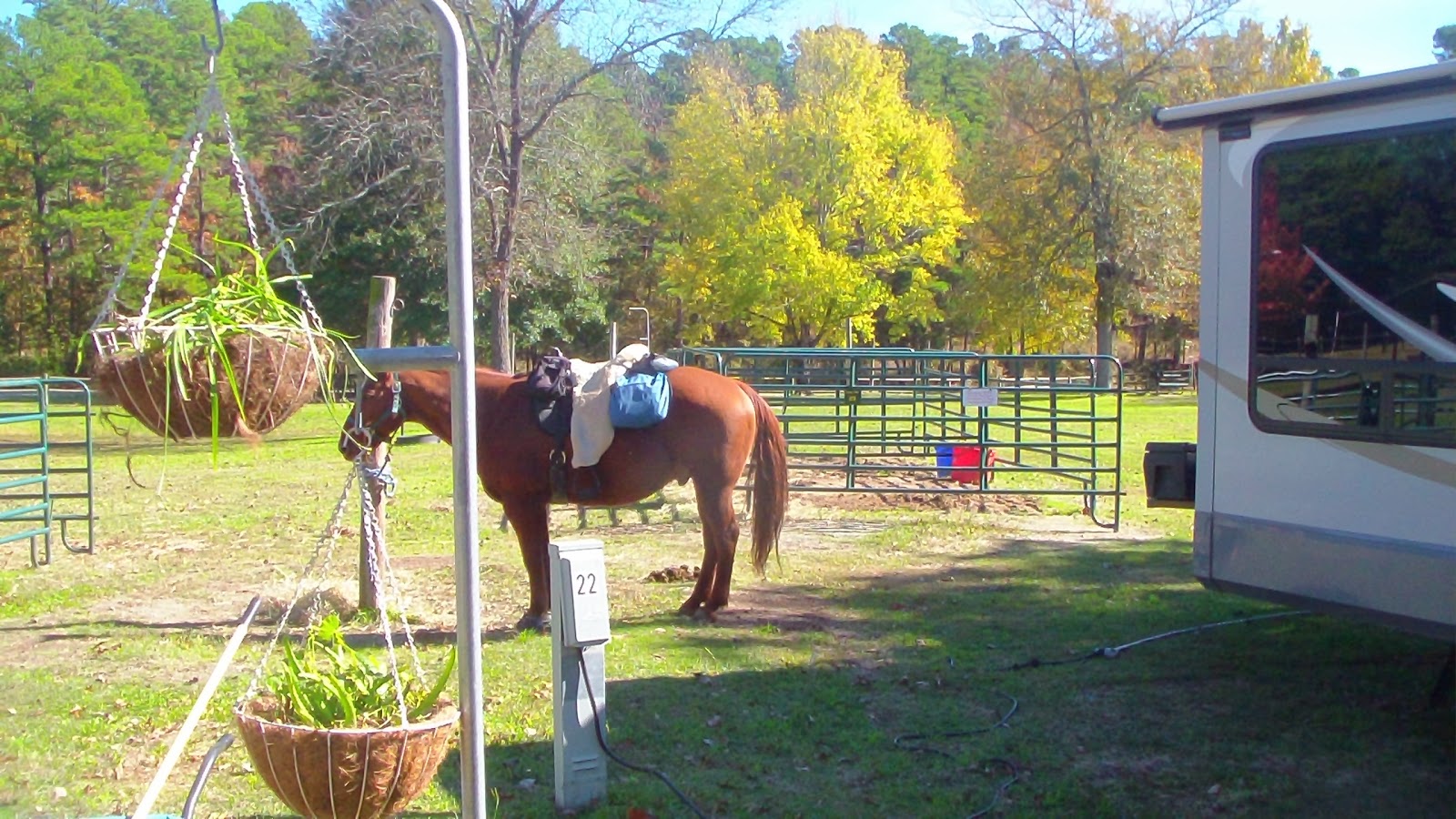 Up extra early so because we have a long drive today, trying to get south before too much cold weeather moves down. Fought a heavy headwind the whole way, using up almot 30% more fuel than usual! Grabbed an egg sandwich at a truck stop next to the freeway, as there were no other restaurants for a long time on our backwoods route. Stopped at Tractor Supply and Walmart before arriving at camp. Despite the office telling me the camp was empty, there were at least a dozen sites taken by other campers, so we had quite a challenge finding a spot long enough. Frankly, this is one of the dumber layouts we’ve seen, with most of the sites at a 90 degree angle to the road, rather than a useful slant, which means very sharp turns, lots of opportunities to knock over posts on both sides of the road, and they idiotically put large rocks along the edge of the road, reducing room to maneuver. Most of the sites are pretty short, and it took us a couple of tries to find one that was actually long enough, and that left room for the horse trailer. They have half a dozen “triple” sites, which is three parking spaces right side by side, which, if used according to design, would leave no room to put out an awning, in fact, almost no room to open your trailer door, much less provide actual “yard” space. We finally managed to get in, put the horses in their corral and got everyone else settled in just before dark. These corrals are the kind that simply “pin” together, so they rattle like crazy, especially when you hang a feed bag on them and the pull at it on every bite, so it was kind of noisy out there all evening. We were both bushed from the long day of fighting the wind, but Hubby still managed to get the satellite dish up and running before we settled in for the evening.