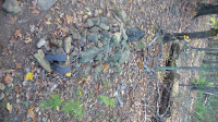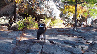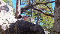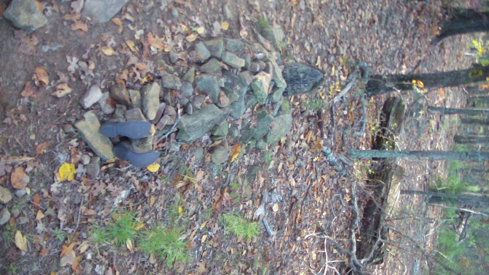 After getting off to a slow start, and having to spend an hour trimming the horses’ feet so we could fit their boots on, we finally got on the trail around 12:30, heading out toward the west perimeter trail. Our plan was to go to the waterfall and loop back down, though we didn’t quite make it because Hubby thought it was getting late and was worried we wouldn’t get back before dark, which after changing the clocks last Sunday, is shortly after 5:00, though with clear skies it would likely be a bit later now. True to the warning, some of the trails were extremely rocky, like a stream bed for long stretches, though there were a few places where they because more dirt and leaves and pine needles, but not for long. Some of the trails were fairly steep, with narrow switchbacks and lots of warnings to stay on the trail and not to cut new trails, including one amusing/threatening fake grave with a headstone promising a similar fate to anyone not using the switchbacks. There was a significant re-route on Governors Trail, and then we either missed a turn or the trail was closed, because we ended up cutting across the middle of a loop to the other side, which put us sort of back on track. Overall, though, the trails and intersections were pretty well marked, though the black and white map could be made a lot easier to read. We never got to the waterfall, and the trip back, even with a stop to have a snack, got us back in camp by 4:00, well before any threat of darkness. Oh, well, we’ll just have to get to the waterfall on our next ride! The horses were well behaved, but not thrilled at the footing either, just too darny rock, even with boots on! Got back, having stopped and chatted with a few neighbors on the way, and got everyone settled in for the night.