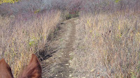 Got up a bit earlier this morning, in anticipation of taking a somewhat longer ride today, under a beautiful sunny sky, though with a cool breeze. Gained. 0.2 pounds again, still thinking it might be the weather : -). Got saddled up and headed out of the camp, which is the same trail for the first mile or so, so naturally the horses were sluggish. They just hate to take the same trail twice! We finally turned off to a new trail, taking the inside orange loop to the south, which ended up as about a 6.6 mile ride. Lots of open spaces, and thankfully, most of the trails were a lot drier today, though there was still the occasional slippery spot. Took some nice canter in the fields along the way, though for some reason, Apollo kicked up on me at least half the time, so I was getting a lot of rodeo practice today! Shortened the ride, though, it took about the same time as yesterday, even though we did more than a mile more. Let the graze again, as we have been all the time we’ve been here, grateful no one has made any remarks about it. Actually, other than my encounter at the office the first day here, it’s been a pretty quiet stay, I’ve been able to catch up on laundry and work. No one’s even commented on the dogs being loose (though, as usual, they never wander off very far). We put the horses’ winter blankets on again, so far managing to prevent their winter coats from filling in, except on their necks, in an effort to prevent hair loss later when we move to warmer climes in the coming weeks. Also, we moved them to the corral next door, as theirs was so muddy and chewed up it just wasn’t drying out (and impossible to clean), whereas the other corral was flat a dry, and thus would be easier to clean in the morning. Anyway, after a very nice (though jumpy) ride, we settled in for the evening.