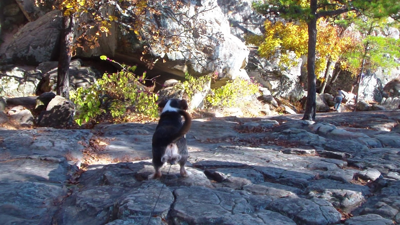 After confirming that Clio’s leg was better but a long way from rideable, we took a drive down to the actual Robbers Cave that this State Park is named after, and my little dog Billy and I climbed up to the cave and around all the rocks. Hubby only went about 100 feet of steep uphill before he sat down with old Marina dog and waited for our return. An interesting rock pile with a famous history of being used by robbers and marauders, with one area used as a “stone corral” for their horses, which even had a hitching post for those who dared to ride out here. Billy enjoyed jumping and sniffing and greeting the many dozens of other people who were climbing the rock with us. After a while we went and found Hubby again, then decided to run down to the stable to see if they had found the missing gray mare yet, but they hadn’t. They had a good lead, though, as someone up the road had just been by to tell them they had heard what sounded like a horse in their field, though they didn’t keep horses, so there’s still hope. Apparently there’s a fence around the whole park, but it isn’t always secure around the entire perimeter. Nevertheless, I can’t imagine she’d go that far from home, it’s just not in their nature to go any further than the nearest grass and water hole. While we were there, I asked about hay, and spoke to a guy who said he had just passed a sign with square bales for sale, so we got directions and took a ride down. The hay looked okay, but the barn would be impossible to reach without disconnecting the pickup from the RV, and frankly, that’s too much of a hassle. Plus the bales were very heavy, and wrapped with wire as well, which I don’t generally like because it makes them hard to handle, and the guy was old and using a cane, obviously disabled, so no help there. We thanked him and headed back to camp, where it wasn’t long before we were feeding the animals and settling down for football.