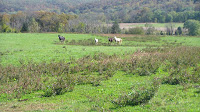 Finished packing up, just about to leave at 10:30 on schedule, when I tried to start the truck and it wouldn’t go. The battery was dead! We got out the generator to see if we could use a new adapter we had bought to charge the battery enough to start it, but that took too long, so we eventually jump started it from the van. Meanwhile, we were trying to figure out why the battery was dead, when I remembered that shortly after we arrived Wednesday, Hubby had closed my truck windows for me, but had left the key on, which I only noticed after it got dark and my automatic lights came on. It was then I discovered the key was still on, but it didn’t occur to me to check the strength of the battery at that time, which I should have done. In any event, we eventually got going, and headed out about a half hour later. The gravel road was wide and open, but the twist, turns and steepness of the grade made it occasionally heart-pounding. Arrived, met by David who directed us to our “campsite,” which was nothing more than a gravel parking area with several electric and water hookups in an open area. The “resort” was actually just a typical farm, all open spaces, pastures, ringed by some woods. We had gotten the impression there would be an old-world farmhouse/plantation kind of structure as the centerpiece, but instead there was a typical, even small, modern ranch style house. There were several large out-buildings like a modern metal barn and stables, but nothing that exuded anything remotely close to “resort.” The guest house was a small brick structure that may have been the original house, but we don’t know that for sure. It looked older than the other structures, though. In any event, Dave was welcoming, indicated he had stalls waiting for us but we asked if we could put them in one of the pastures, which he quickly arranged for us. The pasture was mostly weeds, so we threw some hay in there for our guys. We got set up quickly, satellite dish and all, and we settled in for the evening, feeling exhausted as much from the aggravation factor of having to move as the actual physical exertion.