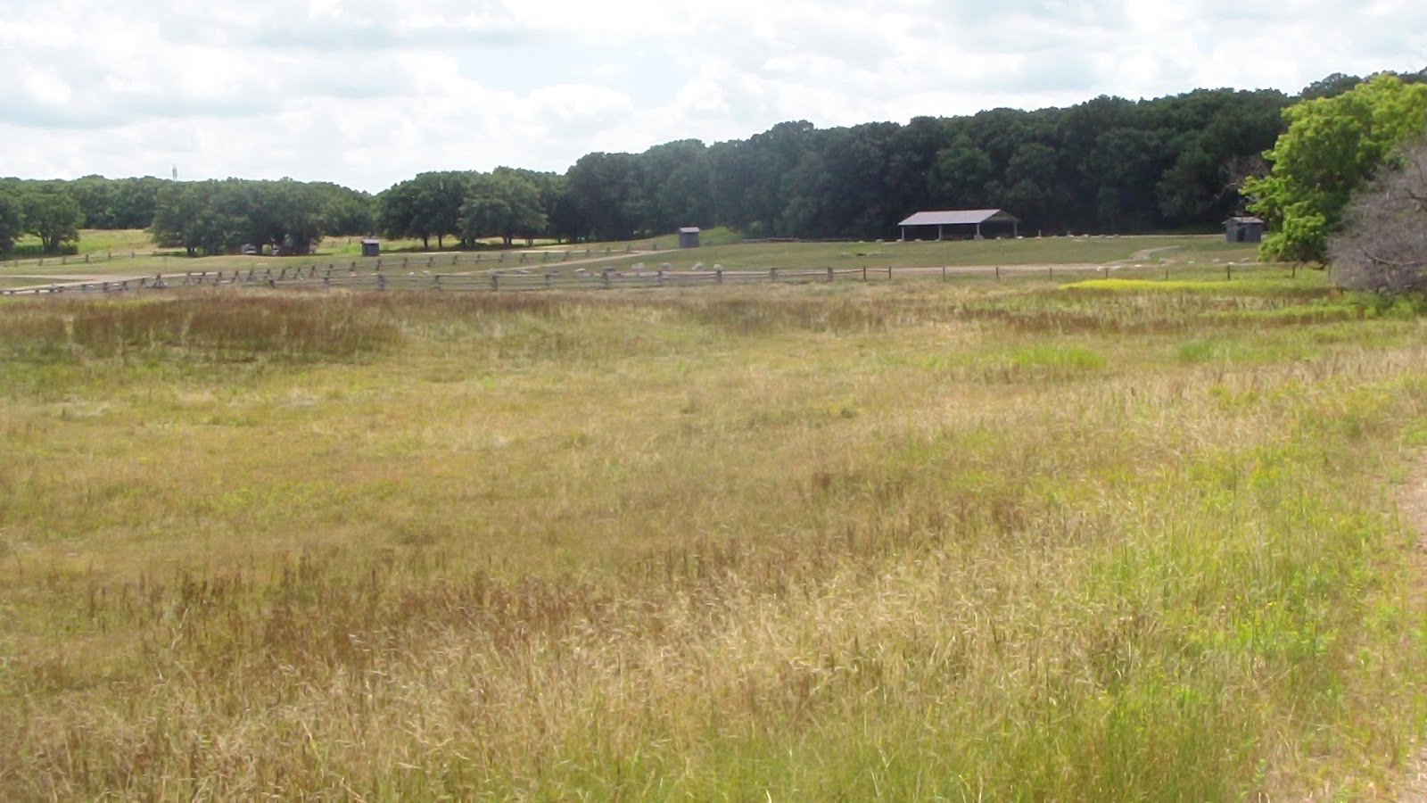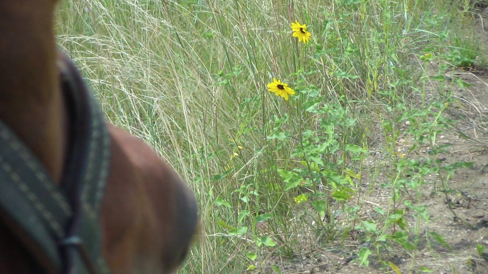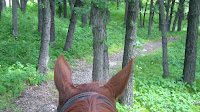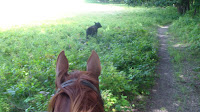 After an even better night sleep last night, and a good breakfast this morning, we saddled up (I went back to my regular saddle, which took a few minutes to re-fit) and headed out the back gate (which appears to be the only way to exit the campground without trying to get over a cattle guard), then circled north to pick up the loop trail at the closest point to the campground. We headed west first, a little disappointed to see they had put some small pea gravel down on the entire trail (on top of lovely sand… go figure,) but later it actually helped us stay on track a bit, as it was often the only thing that clued us as to it being the right trail whenever we came to an intersection of other trails (which was often!) As long as we followed the gravel, we managed to stay on track. My Google-made trail was perfect for the first half of the loop, then got off quite a bit on the second half because of a wrong turn I made, but we just kept following the gravel, and the posts that popped up at opportune moments with HH on it, and that kept us on track. At one point we saw some cattle, and when they saw us, a few started heading down a road in the general direction of where we were headed. Now, although they have a lot of quarter horse in them, my horses haven’t really been around cattle that much, and Apollo started to get a bit excited when he saw them, and in particular when they headed for us. As they came down the road, we realized that we would have to cross that road directly in front of them in order to stay on the trail, and it became a test of timing. I didn’t want to hurry Apollo along (it’s never a good idea to teach a horse to run when it gets nervous), so I actually slowed him down to let him get a good look at them, except that meant they were getting closer to the spot where we would intersect with them. Fortunately, we made it to the crossing while the cows were still about 50-60 feet away, then Apollo started moving up the trail sideways so he could keep on eye on the critters behind him. Once they ignored him and passed us, he settled down again. Later on, we ran across a lost dogie near the trail, and he handled it with much more dignity, probably because there was only one, and it was small. As for the trail, other than the gravel, it was wonderful! Very surprising actually. We thought that because the terrain appeared to be mostly grassland that it would be a fairly boring ride, but the trail managed to weave itself through practically every copse of trees on the tract. Some were copses of oaks, others Aspens. In between we were able to trot and canter regularly, which my horse really got a kick out of, since we had been doing mostly walking while my niece was here. We didn’t get lost during out three hour ride because we followed the gravel, but there were obviously a lot of other trails out here without gravel, which would provide more interest for anyone staying longer than the few days we will be here. Nevertheless, it is a small tract, so the variety would be limited. Though water is a bit of a challenge, this is a very nice campground, and will definitely stay on our North Dakota list!