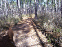 At last, we have a chance to ride. At first we thought it would be too cold, but the sun started warming up things pretty nicely, and we decided that we’d dress extra warm, wear our parkas and take a chance. Our original plan was to take the yellow trail to the red trail to the blue trail, which is a long loop, then back again. Before we got to the blue trail, however, we ran into high water, and a one-lane bridge with a sign that said “Impassable with high water.” It wasn’t kidding. We were horse-chest high in water and we still had 5 or 6 yards to the bridge. We couldn’t even tell what the bridge was costructed with, and were very concerned that the horses might get freaked out when the surface changed under their hooves, so we decided caution was in order and we retreated back up the red trail. We went for option B, which was the yellow trail to the green trail in a figure 8, before heading back to the campground, We did run into a few more water hazards, but nothing more than knee-high, which my horse barreled through (once he got started :-). Truly nice trails, though, very well-marked, several picnic tables and hitching rails to stop for lunch along the way, good footing except for a few muddy spots (understandable with all the rain), mostly pine needles and sand, no need for shoes or boots. Was out about 4 hours in the end. A lovely day!