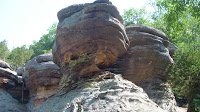 Persuaded Hubby to drive with me over to the big attraction of the Shawnee National Forest, the proverbial Garden of the Gods, a magnificent grouping of rock outcroppings that provide a fantastic view and a nice ¼ mile walk. We also wanted to reconnoiter the area to see about trailering the horses over tomorrow, since it seems there are bridle paths throughout the area. It was a great time, the walk and views were fabulous, and we found the trailhead where apparently horses were allowed. As we were driving back, we noticed a group of horse trailers parked along a bare patch of the road, we thought it looked like a private campground so we pulled in to chat. Turns out there’s a small cabin and a lot of corrals which are shared by a group of riders, kind of a neat cooperative! Anyway, they were very nice, very helpful, gave us some good ideas, showed us some maps, which gave us some ideas. They also recommended we check out Pine Knob, a private campground with well recommended trails (a passing ranger had said the same thing ath Cadiz Camp), so we headed out there, if nothing else but to satisfy our curiousity. It was closer to the camp than Garden of the Gods, but we had to go up several miles of a dirt and gravel road to get there. It turned out to be quite disappointing, actually, little more than an open field with horse trailers parked willy-nilly, a string of highlines along each edge of the parking area, no notable features except that scattered throughout the area they had humorously put up facades of typical wild west buildings, like “livery” and “jail” and “post office.” They had an actual camp store (essentially a metal barn), and we went in to get the particulars. Had a chat with a girl with a stud in her nose about day parking, and she was nice enough to give us a Shawnee Forest Map, and to sell us a map of the trails that are around their campground. I don’t know if it was partly because of the heat (it was pushing close to 100 degrees by then) or just the atmosphere of the place, but something just didn’t sit right with us about it, so we decided that rather than park there the following day, we would return to trailhead parking at the Garden of the Gods. We figured if we got there early enough, we would have plenty of room the park the trailer, even though the lot was just about full when we had gone through there earlier, no doubt busier than usual because it was Memorial Day weekend. We wanted to beat the heat anyway, so early it would be! After some initial reluctance, Hubby ended up enjoying the day, the walk, and the exploring, so we celebrated with a steak and had an early night.