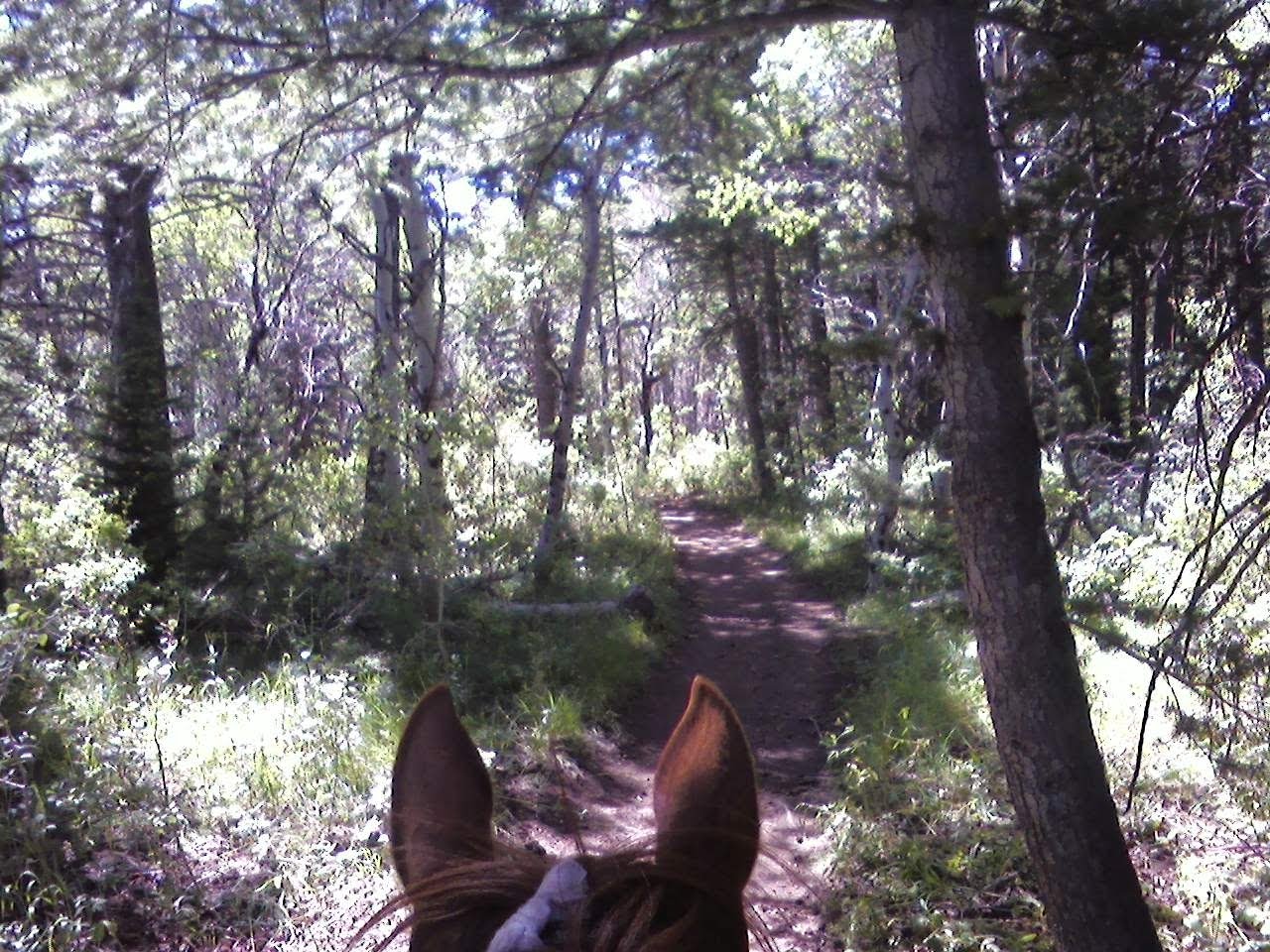 Slept decadently late, Hubby even fed the horses for me because he figured I must’ve had a rough night if I was still in bed at 8:30 (he was right). Saddled up and was on the trail by 11:00. Headed southwest on the Boundary Trail (fortunately, dirt trails and creek crossings, no stones to speak of except the creeks) until we came to an intersection. One trail went to Robber’s Roost, the other was unmarked, and the third was the continuation of the Boundary trail. It kind of looked like the Boundary Trail got a little rocky, so we opted for Robber’s Roost, though we had no idea how long it was. We started climbing (what else is new!), and we hadn’t gone a quarter mile when the trail started getting really rocky, so opted out and turned around. Then we went down the unmarked trail, which stayed in the valley and followed the creek until it reached a fence about half mile away. So we turned around again, resigned to taking the Boundary trail and hoping that rocky bit was saw was short-lived. Fortunately, that turned out to be EXACTLY the case. The trail only climbed a little bit, and only a little bit at a time, with almost entirely dirt trails (with just the odd short rocky bit here and there), very moderate ups and downs, and, for the first time in what seems like weeks, opportunities to actually trot and canter! The forest was beautiful, a wonderful mix of aspen and conifers and in the occasional field, sagebrush. There were so many different types of evergreens I couldn’t identify them all, and some were so huge they must have been there for 400 years! I’m no expert, but I know I saw white pine, red cedar, probably blue fir, lodgepole and I don’t know what else. It was the nicest ride we’ve had in a while. We went about 5 miles to a lovely creek, stopped there to have lunch, and then headed home. We had decided early that because it was such a nice ride, we’d make it short and do another one in the opposite direction tomorrow. The entire Boundary Trail is too long for us to do in one day (I estimate more than 16 miles, which we might do if we had more time, but not this trip), so another short day tomorrow to keep us fit and the horses happy. One thing I discovered on the trail, I could, in fact, get a cell phone signal in many areas, so when we got back in camp, I turned the phone on and did my compass check (I turn to each point of the compass to see which direction I get the best signal) and discovered that I did, in fact, have a signal that should be good enough to retrieve my email. Once the horses were put up, and after a conversation with our departing neighbor (a pair of foster parents with 3 foster kids who live just on the other side of the mountain range to our West, in Inkom), I came in and sure enough, found I could download my email. I also have to get directions to an RV store from which I have ordered a new electrical cable, as well as to confirm where we are going to pick up hay. Apparently Dillon, MT is the hub for locally produced certified weed-free hay, and I spoke to several folks about price and availability, and, as always, the market systems works. The price is lower than I’ve found in a number of other places. Competition is great! We want to get a full load, which should get us into California.