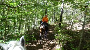 Another good night sleep, woke up to a beautiful morning, started the day off with a load of laundry so that I would have nice clean sheets tonight. Did my usual morning chores and breakfast, and Patsy arrived just after 10:00, so we saddled up and hit the trail forthwith. Another gorgeous ride! Flash was much more sedate for the first several miles, we took turns on the lead, and he actually didn't pull my arms out too much, at least at first. We started on the Blue Trail which parallels the river, one of my favorite trails up here, then took the big purple loop before taking the speedy yellow back to camp. While Flash was more sedate at the beginning, once we were warmed up and started moving faster, he did his best to make out like it was a race. He was slightly more under control today, though, possibly because I tightened up his snaffle bit a little yesterday, but it was still a thrilling ride! Once we got going, we trotted/gaited for many miles, though I was able to hold him back from his strong desire to canter most of the time. Not that I mind, he has a lovely canter, I just didn't want to leave Patsy and Atlas (her other horse today) in the dust! We did just under ten miles, and enjoyed every minute of it! Rinsed off their well-deserved sweat and put them away, then chatted for a bit with Patsy before she headed out. Another wonderful day on the road! Brought in my laundry, took Apollo and Lola for a walk around the camp, and brought out Lola's pool and filled it, as she's been panting like crazy lately, even though it hasn't really been that hot. It made a difference, though, she's been much more settled this evening. Last night she was very restless, took her an hour to settle down for the night. My usual routine, off to bed soon! Good night, baby! Love you!