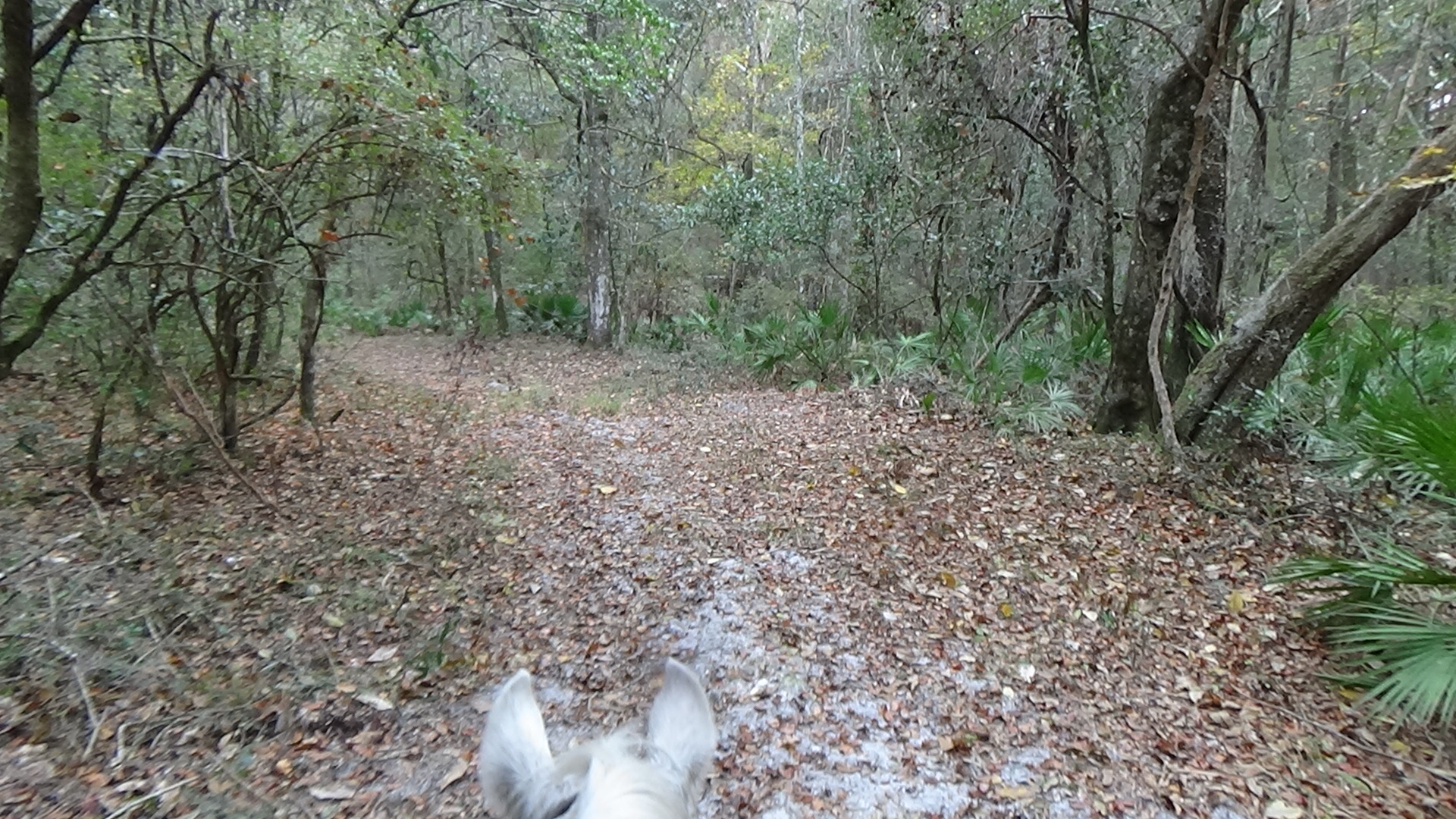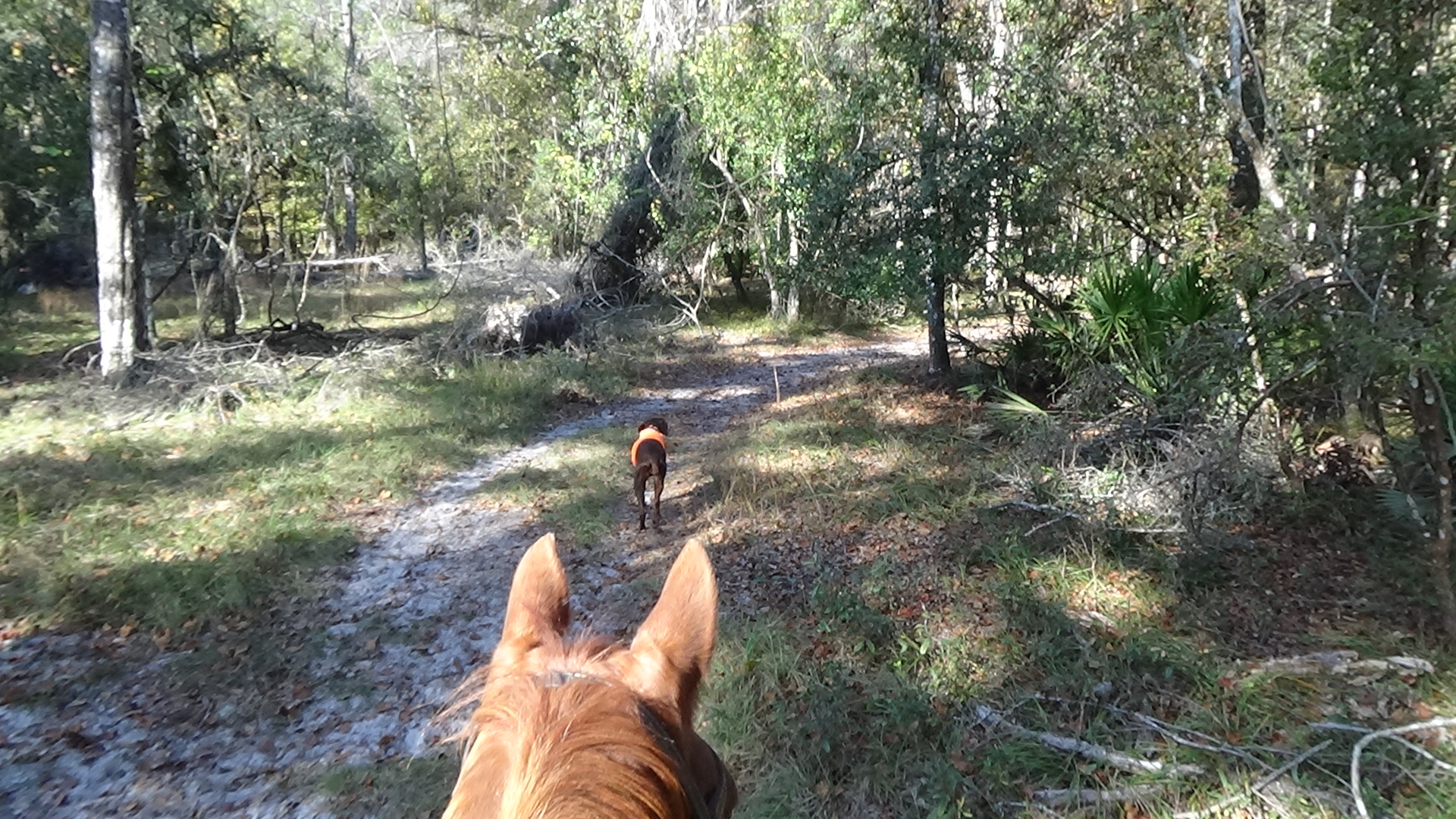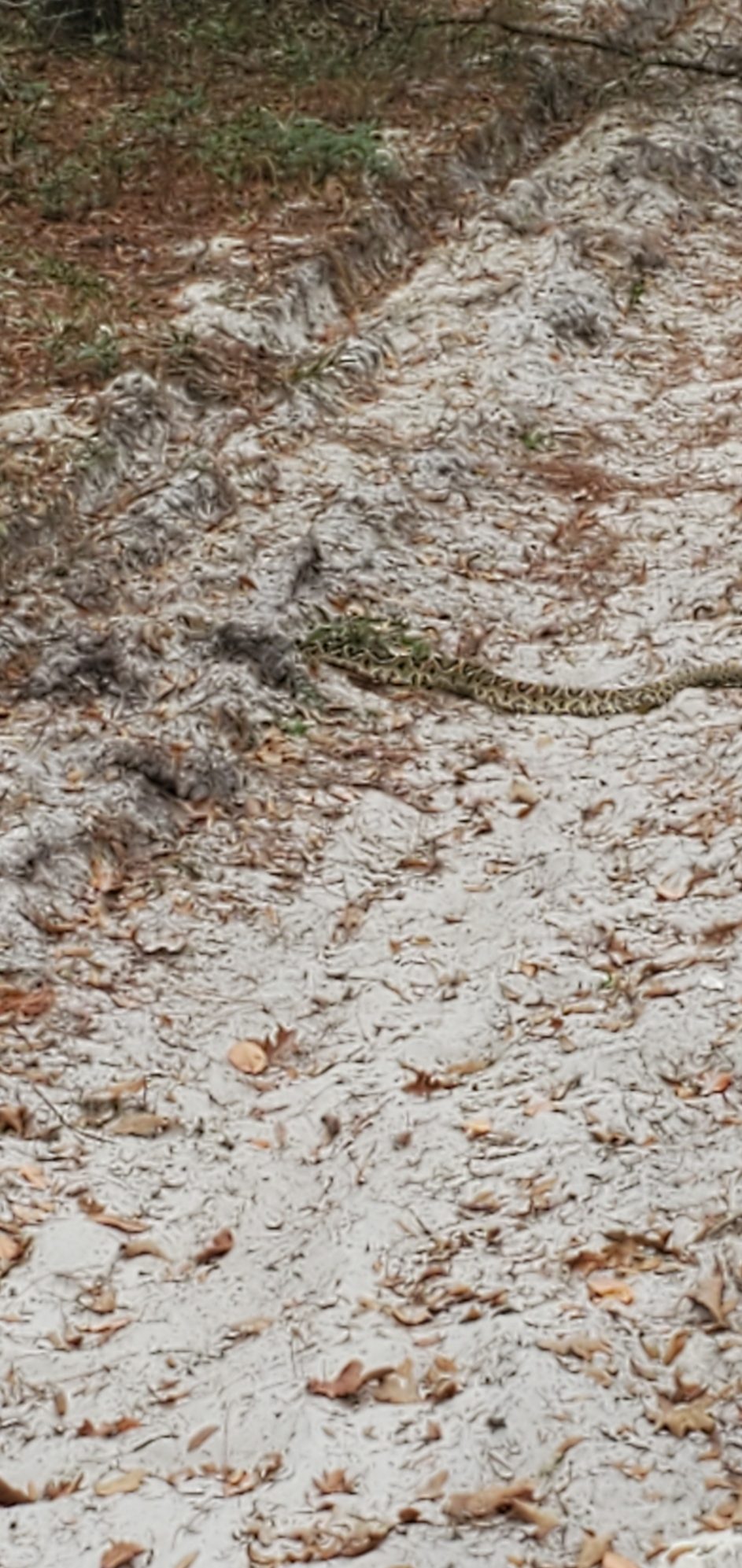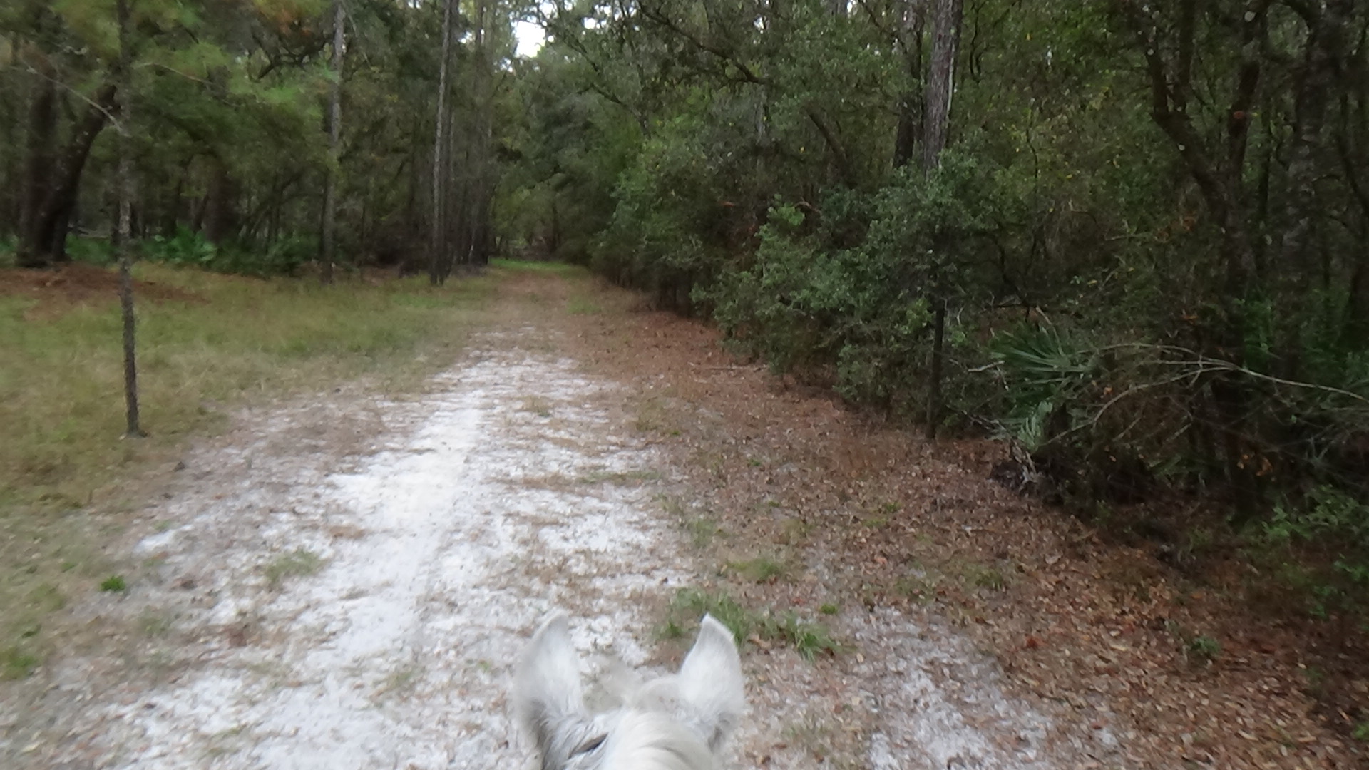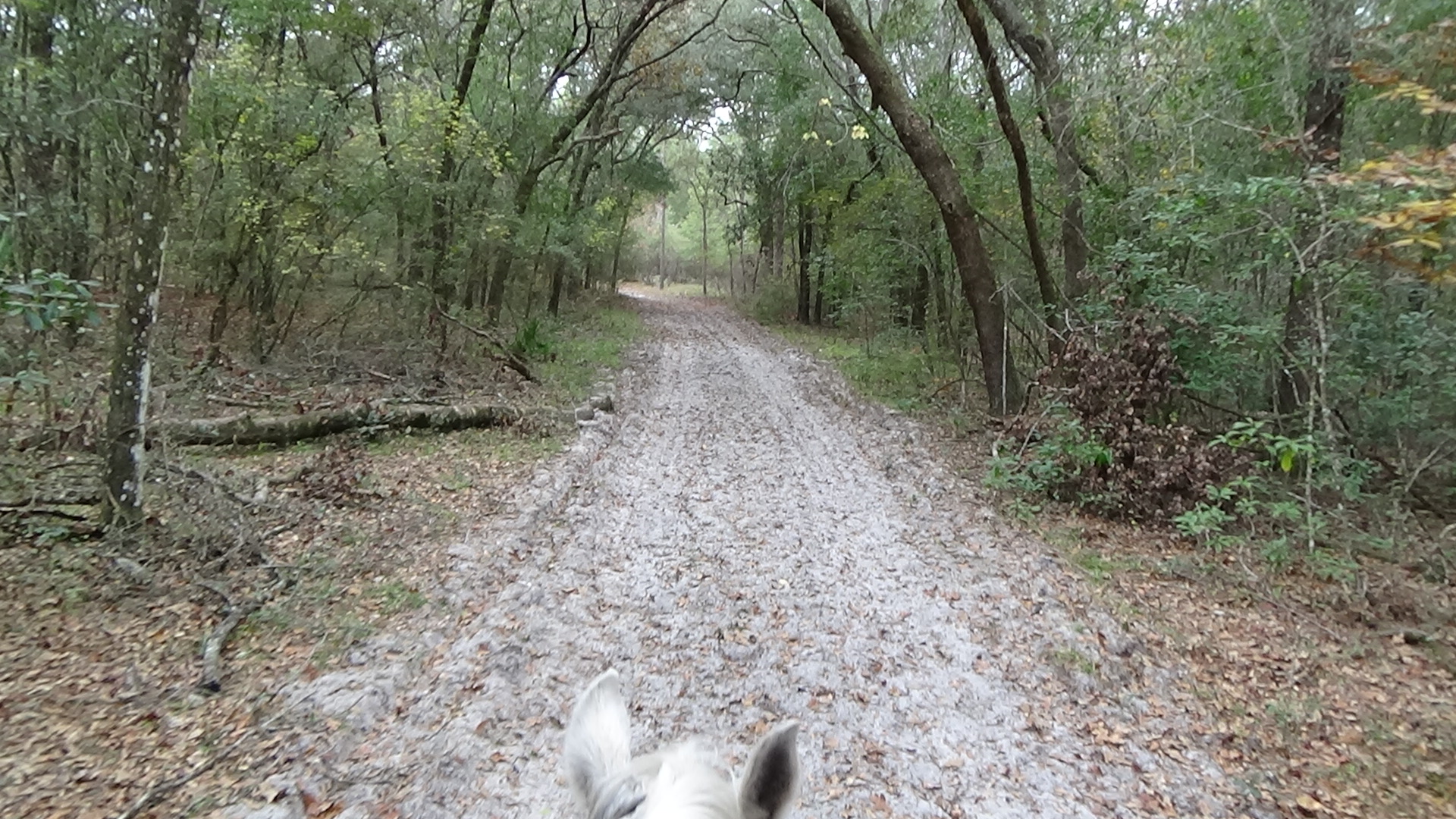 What a great day! It started out with a much better night sleep, confirming my supposition that it was the overdose of aspertame that was preventing me from sleeping well. I had none of the previous afflictions after resuming a mostly water beverage diet today. After breakfast I had to fill up the water in my truck tank and refill the camper, then I finally saddled up Flash and headed out on the trail. We took the long perimeter trail, crossing 441 and riding all the way up to O'Leno State Park. I'd forgotten how beautiful it was on this side of the forest! Flash was brilliant once again, averaging nearly six mph for the day. We did over 14 miles in just under three hours, and got a tremendous amount of galloping, cantering and gaiting in. It was wonderful! About halfway around we went by a cattle or dairy farm, and we were sorry to see a dead cow in a copse of trees, and another cow, still alive, but laying down and not looking very well. So sad! Not far out from camp, there was a long rattlesnake crossing the trail in front of us, and when I stopped to take a picture, it started to rattle and curl up, so we moved along quickly to get past it. What a truly gorgeous ride! The weather is due to turn colder, so I wanted to get a good ride in before that happened, and I couldn't have asked for a better day, or a better horse. Flash truly is a wonder! Gave him a good rinse off with a brush before putting him away, and was happy that he didn't immediately roll in the dust, as he is wont to do. Settled down for the rest of the day to reading and bingeing on TV, and am looking forward to a quiet day for Thanksgiving tomorrow. Good night, my darlin'! Love you!
